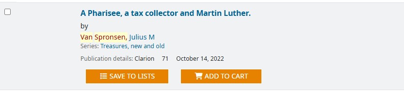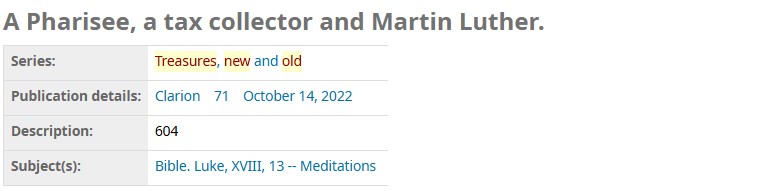 Clarion, Diakonia, Koinoinia, Preach the Word, and Reformed Perspective (main articles) are indexed by the librarian at CRTS. Lux Mundi is also indexed, starting with volume 25 (2006). Some of the data has come from different databases, so the data for older publications lacks consistency, but it is still useful to find articles.